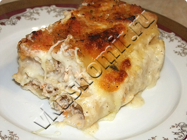 Наполнить каннеллони рыбным фаршем с помощью кондитерского мешка и выложить в форму. Залить оставшимся белым соусом.